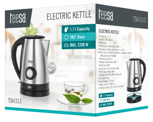 Czajnik z płaską grzałką płytową pozwala zagotować każdą, nawet najmniejszą ilość wody. Jeśli natomiast potrzebujesz zagotować pełną pojemność 1,7 l, czajnik Teesa o mocy 2200 W pozwoli Ci na to w dość krótkim czasie. Gwarancją bezpieczeństwa użytkowania czajnika jest funkcja automatycznego wyłączania oraz zabezpieczenia przed włączeniem bez wody. Czajnik Teesa TSA1513 to nie tylko sprzęt, to ekspresja stylu i pasji do gotowania. Zamów już dziś i wprowadź do swojej kuchni odrobinę luksusu i funkcjonalności!