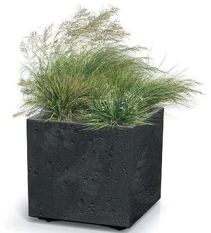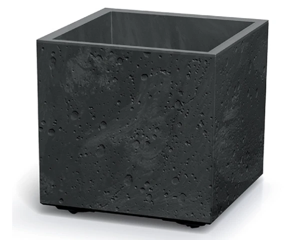 Donica kwadratowa 39 x 39 cm w kolorze czarnym Sierra. Dekoracyjna struktura ścianek donicy ogrodowej Sierra imituje beton architektoniczny. Do donicy dołączony jest praktyczny wkład, który ułatwia przesadzanie oraz przestawianie roślin.