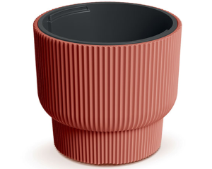 Donica mrozoodporna z ryflowaną powierzchnią. Donica okrągła jest wykonana z wysokiej jakości tworzywa sztucznego, odpornego na działanie wysokiej temperatury, mrozu oraz promieniowania UV. Doniczka posiada praktyczny wyjmowany wkład, który odprowadza nadmiar wody i zmniejsza ilość wykorzystywanego podłoża.