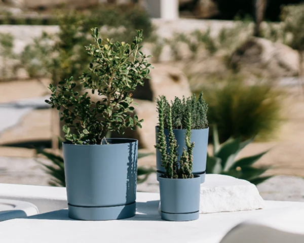 Szara donica na kwiaty z podstawką w tym samym kolorze jest znakomitą ozdobą minimalistycznych aranżacji. Matowe wykończenie doniczki to stonowany projekt dostosowany do najnowszych trendów.