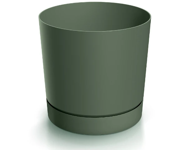 Zielona donica na kwiaty z podstawką w tym samym kolorze jest znakomitą ozdobą minimalistycznych aranżacji. Matowe wykończenie doniczki to stonowany projekt dostosowany do najnowszych trendów.