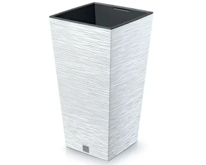 Donica kwadratowa wykonana z solidnego tworzywa sztucznego z prążkowaną fakturą. Donica wysoka posiada wewnętrzny wkład o pojemności 14 litrów, który zapobiega przelaniu korzeni i zmniejsza ilość wykorzystywanego podłoża. Doniczka kwadratowa posiada na dnie praktyczny korek, który ułatwia odprowadzenie nadmiaru wody.