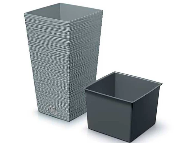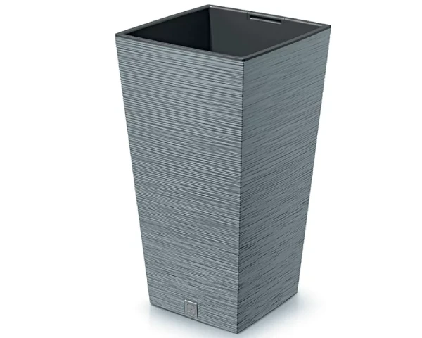 Donica kwadratowa wykonana z tworzywa z prążkowaną fakturą. Donica wysoka posiada wewnętrzny wkład o pojemności 24 litrów, który zapobiega przelaniu korzeni i zmniejsza ilość wykorzystywanego podłoża. Doniczka kwadratowa posiada na dnie praktyczny korek, który ułatwia odprowadzenie nadmiaru wody.