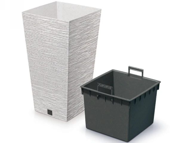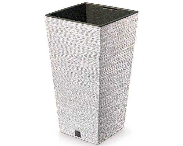 Donica kwadratowa wykonana z tworzywa z domieszką drewna, dzięki czemu jej powierzchnia ma ziarnistą strukturę. Donica wysoka posiada wewnętrzny wkład o pojemności 11 litrów, który zapobiega przelaniu korzeni i zmniejsza ilość wykorzystywanego podłoża.