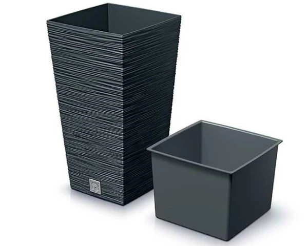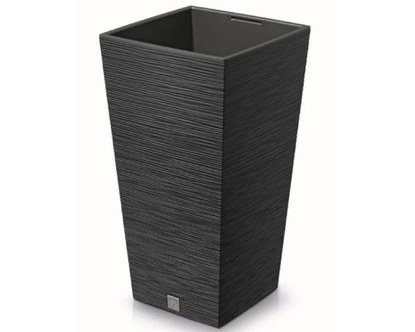 Donica wysoka z wkładem Furu jest wykonana z solidnego tworzywa sztucznego z prążkowaną fakturą. Donica kwadratowa posiada wewnętrzny wkład o pojemności 11 litrów, który zapobiega przelaniu korzeni i zmniejsza ilość wykorzystywanego podłoża. Doniczka z wkładem w kolorze antracytowym posiada na dnie praktyczny korek, który ułatwia odprowadzenie nadmiaru wody.