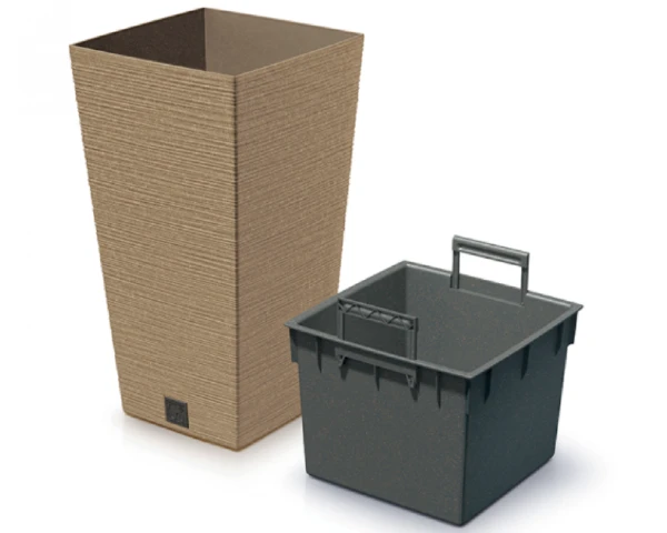 Donica kwadratowa wykonana z tworzywa z domieszką drewna, dzięki czemu jej powierzchnia ma ziarnistą strukturę. Donica wysoka posiada wewnętrzny wkład o pojemności 5 litrów, który zapobiega przelaniu korzeni i zmniejsza ilość wykorzystywanego podłoża.