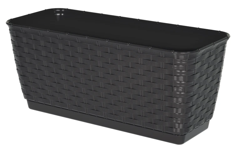 prostokątna doniczka o fakturze wiernie imitującej plecionkę rattanową. Głębokie, doskonałe dla wszystkich typów roślin. Obrzeże doniczki wywinięte jest na zewnątrz.