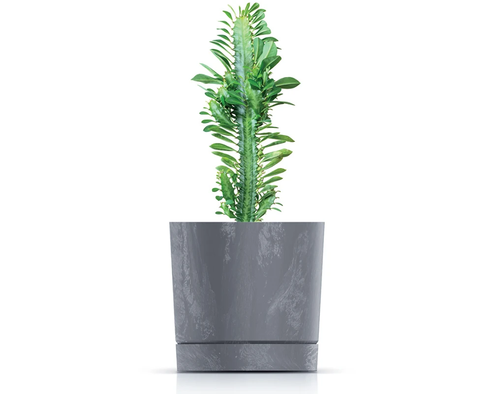 Doniczka okrągła o pojemności 8 litów. Doniczka z podstawką jest wykonana z solidnego tworzywa sztucznego, które imituje wygląd betonu. Doniczka z matowym wykończeniem pasuje między innymi do wnętrz w stylu industrialnym lub loft.