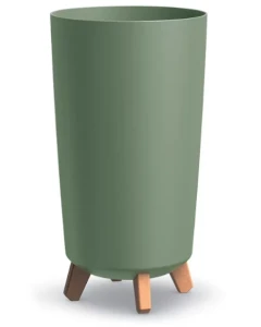 Donica wysoka o średnicy 23,9 cm i wysokości 45 cm. Prosty kształt i matowe wykończenie podkreślają uniwersalny styl donicy. Doniczka na nóżkach posiada wewnątrz wkładkę drenażową, która zastępuje keramzyt i odprowadza nadmiar wody, chroniąc korzenie przed przelaniem.
