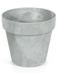 Doniczka okrągła o pojemności 1,2 litra. Donica jest wykonana z solidnego tworzywa sztucznego, które imituje wygląd betonu. Doniczka w kolorze szarym nadaje się w 100% do recyklingu.