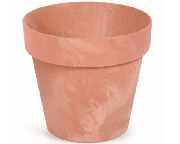 Doniczka okrągła o pojemności 29 litrów. Donica jest wykonana z solidnego tworzywa sztucznego, które imituje wygląd betonu. Doniczka w kolorze terakoty nadaje się w 100% do recyklingu.