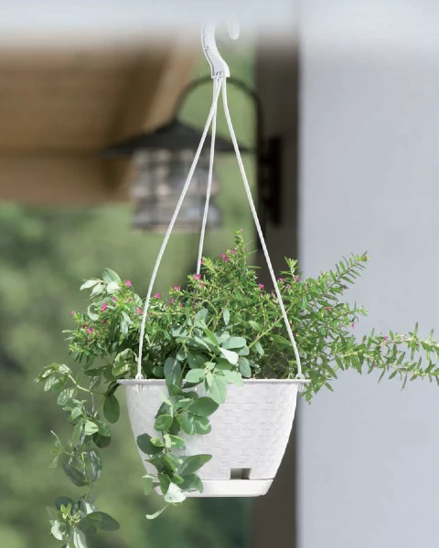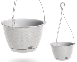 z kolekcji RATOLLA z charakterystycznym, wywiniętym rantem oraz fakturą imitującą plecionkę rattanową. Dostępna z plastikowym lub stalowym systemem podwieszania. W podstawce znajduję się otwór pomocny w podlewaniu.