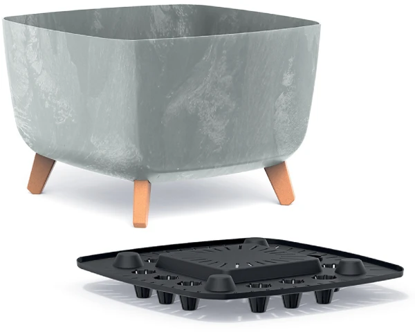 Doniczka na nóżkach wyróżnia się wykończeniem z efektem betonu. Donica niska posiada wewnątrz wkładkę drenażową, która zastępuje keramzyt i odprowadza nadmiar wody, chroniąc korzeniem przed przelaniem.