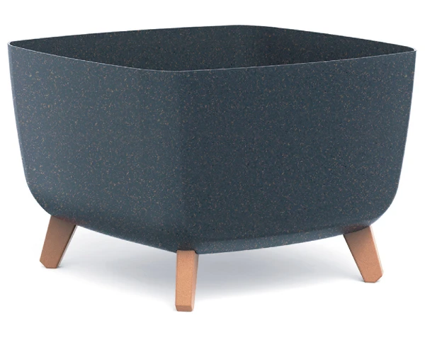 Donica kwadratowa na nóżkach jest wykonana z tworzywa z domieszką drewna, dzięki czemu jej powierzchnia ma ziarnistą strukturę. Donica niska sprawdzi się w uprawie roślin o rozwiniętym, płytkim systemie korzeniowym. Doniczka posiada wewnętrzną, perforowaną wkładkę drenażową, która zapewnia odpływ nadmiaru wody.