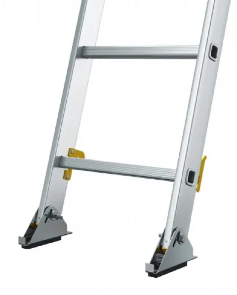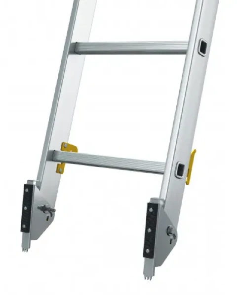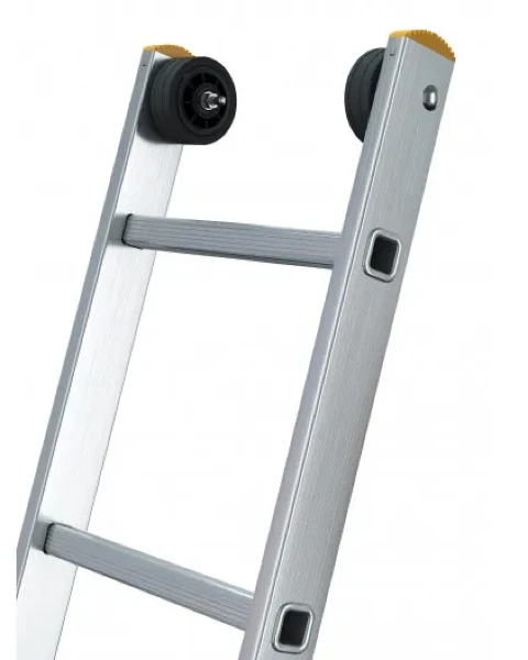 Drabina wykonana jest z wysokogatunkowego aluminium, odpornego na korozję i uszkodzenia, co zapewnia trwałość i komfort użytkowania zarówno na zewnątrz, jak i wewnątrz budynków. Profilowane, tłoczone szczeble o profilu 28×28 mm oraz masywne podłużnice (60×20 mm w bocznych, 70×20 mm w środkowym elemencie) gwarantują stabilność i swobodę pracy. Ruchome stopki – z metalowymi zębami i antypoślizgową powierzchnią – oraz gumowe kółka umożliwiają bezpieczne użytkowanie na różnych powierzchniach, w tym schodach czy gruncie