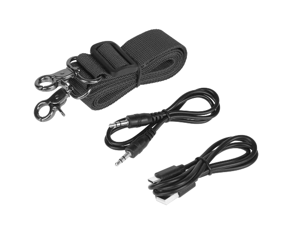 - W zestawie: Kabel USB-C (75 cm), kabel AUX 3,5 mm (53 cm), pasek, instrukcja obsługi