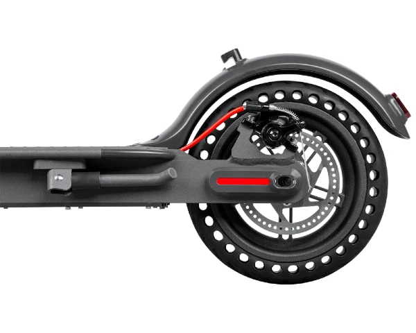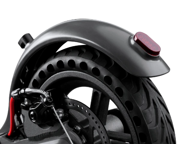 Hulajnoga została wyposażona w ręczny hamulec tarczowy, dzięki czemu zatrzymując się nie musisz zdejmować nogi z podestu. Dodatkową przewagą takiego hamulca nad tradycyjnym, nożnym jest mniejsze zużycie kół.