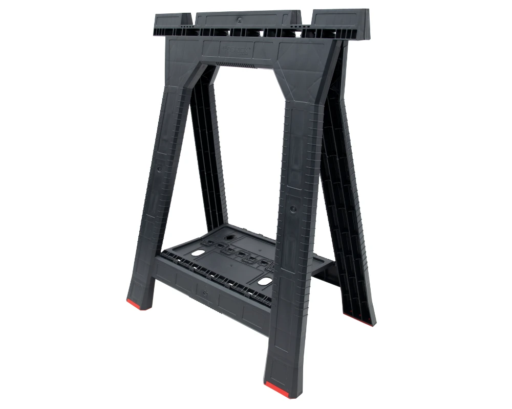 Antypoślizgowe nóżki zapobiegają wibracjom i przemieszczaniu się stojaka podczas użytkowania. Dodatkowa półka między nogami zapewnia stabilizację oraz posiada dodatkowe uchwyty na narzędzia ręczne.