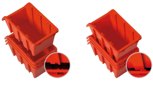 Dzięki przemyślanej konstrukcji pojemnik warsztatowy można ustawiać jeden na drugim albo użyć jako kuwetę warsztatową na ścianie za pomocą specjalnych listew lub tablicy narzędziowej.
