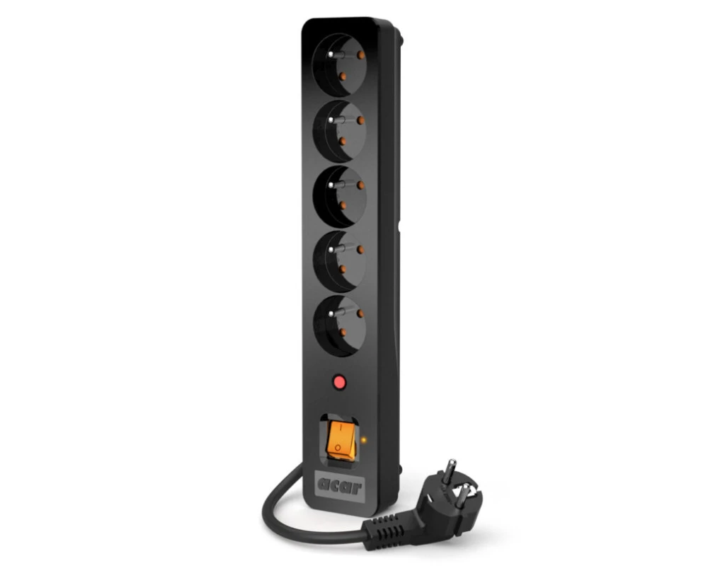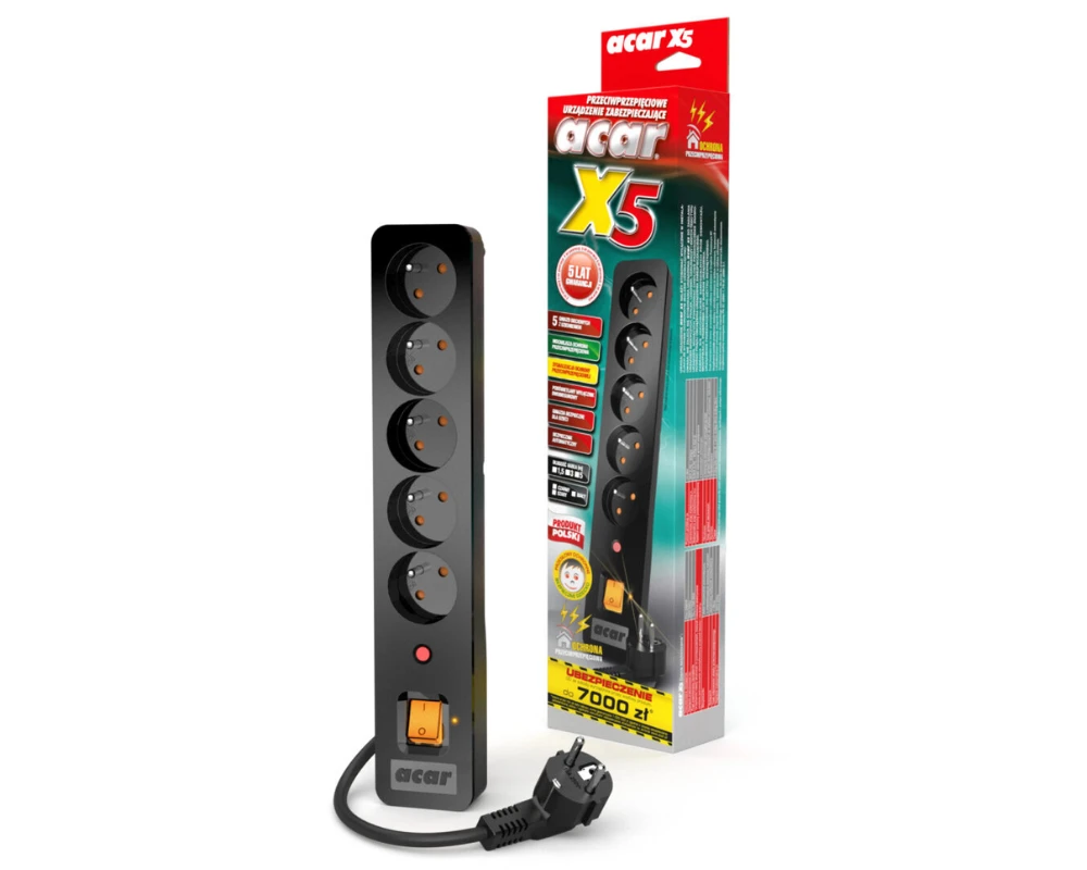 Przepięcia mogą wystąpić w przypadku nagłego wzrostu napięcia w sieci elektrycznej, na przykład w wyniku uderzenia pioruna, zwarcia lub innych zakłóceń. Chroń skutecznie kosztowny sprzęt elektroniczny przed uszkodzeniem lub zniszczeniem i zastosuj specjalnie opracowaną listwę Acar X5.