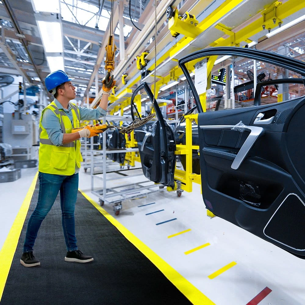 Mata ergonomiczna do pracy stojącej w przemyśle. Typowe zastosowania: linie produkcyjne, stanowiska montażowe, stanowiska pakowania, stoły warsztatowe itp.