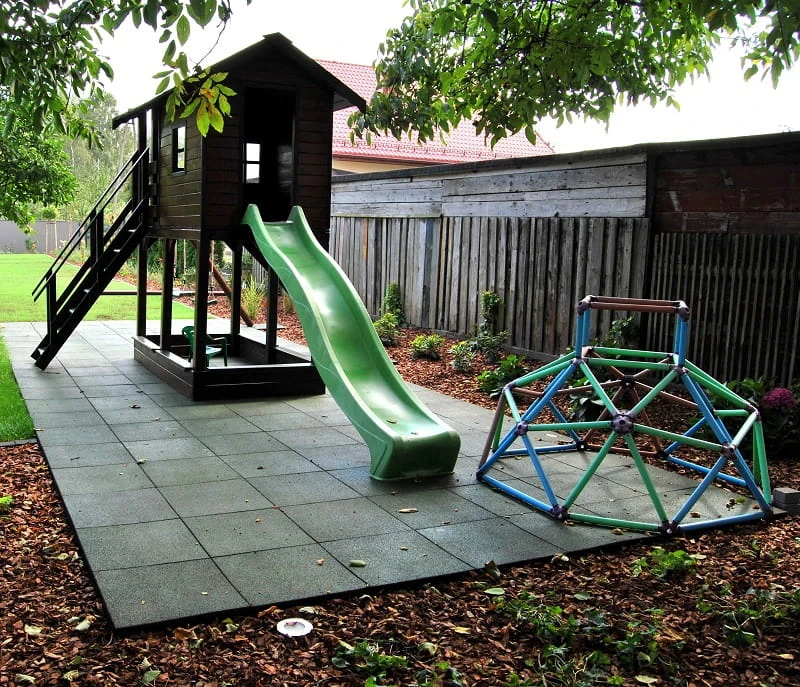 wysokiej jakości warstwowa płyta gumowa, polecana jako nawierzchnia do przydomowego placu zabaw, szczególnie dla młodszych dzieci.