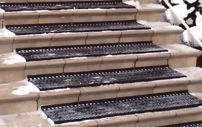 Specjalny grzebień mocujący matę do schodów umożliwia łatwe uniesienie jej i oczyszczenie stopnicy schodowej z zalegającego śniegu i brudu.