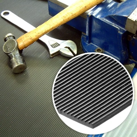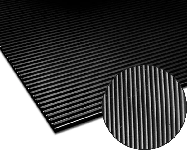 Gumowa wykładzina, mata przemysłowa o strukturze kanałowej [ryfel] o właściwościach antypoślizgowych.
