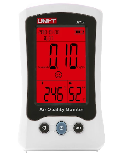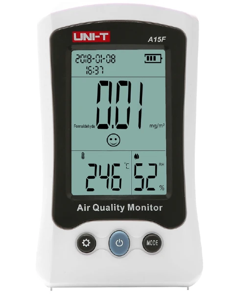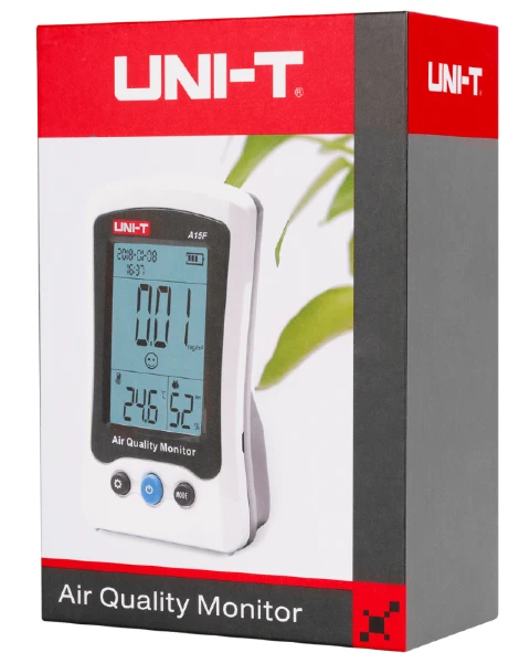 Miernik temperatury, wilgotności i jakości powietrza Uni-T A15F to gotowe do użytku urządzenie elektroniczne, które znakomicie sprawdzi się w warunkach domowych. Sprzęt pozwala na precyzyjny pomiar zawartości formaldehydu w powietrzu, a w przypadku przekroczenia jego bezpiecznej zawartości sygnalizuje zagrożenie użytkownikowi.