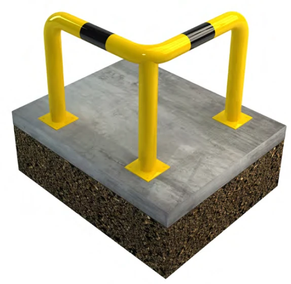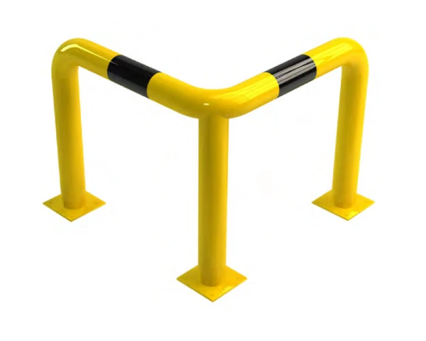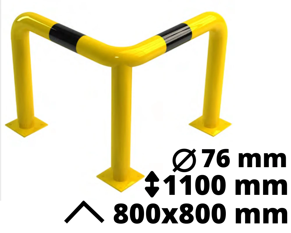 Odbojnica kątowa ze stali wys. 1100 mm 800 x 800mm Ø76 mm stosowana do zabezpieczeń słupów konstrukcyjnych, naroży budynków, regałów. Zalecana do zabezpieczenia słupów wolno stojących lub innych elementów wymagających najwyższej ochrony.