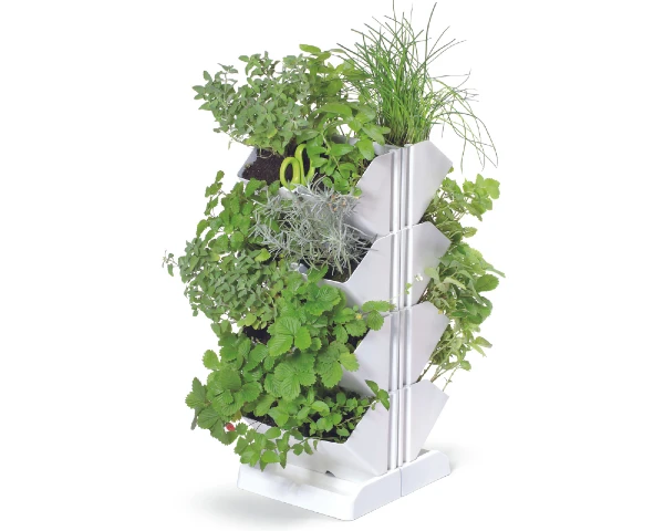 Ogród wertykalny do roślin i ziół w wersji mini to modułowy system doniczek z podstawką. Ta biała doniczka idealnie sprawdzi się do ziół w kuchni.