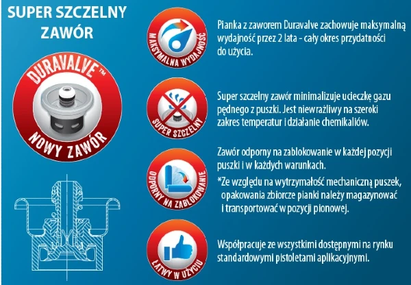 Pianka z zaworem Duravalve zachowuje maksymalną wydajność przez 2 lata - cały okres przydatności do użycia.