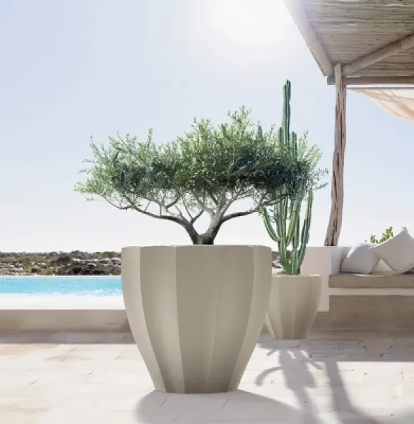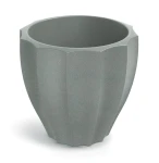 Rona to nowoczesna donica o nietypowym kształcie, zwężająca się ku dołowi i ozdobiona głębokimi, pionowymi żłobieniami. Dzięki szerokim krawędziom i masywnej sylwetce zyskuje wizualną stabilność, która doskonale wpisuje się w charakter przestrzeni zewnętrznych. Jej dopracowana forma i szlachetna faktura czynią ją idealnym wyborem do eleganckich aranżacji z roślinami.