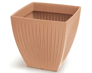 Donica kwadratowa terakota Latia Square. Duża donica wykonana z matowego tworzywa z delikatnie żłobionymi ściankami. Klasyczny kształt doniczki na kwiaty wyeksponuje ulubione rośliny w domu lub ogrodzie.