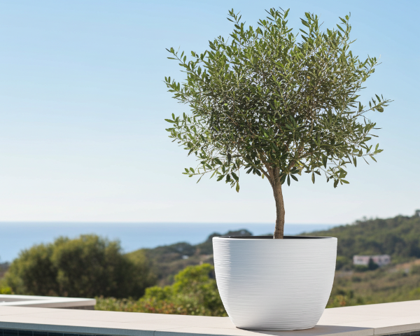 Średnica 57 cm i głęboki wkład (56L) to doskonała baza dla okazałych gatunków. Donica idealnie nadaje się dla Oliwki Europejskiej, Palmy karłatki (Chamaerops humilis) czy mrozoodpornej Palmy szorstkowca (Trachycarpus fortunei). Świetnie wyglądają się w niej również duże formy Bukszpanu oraz ozdobne trawy, jak Miskant chiński.