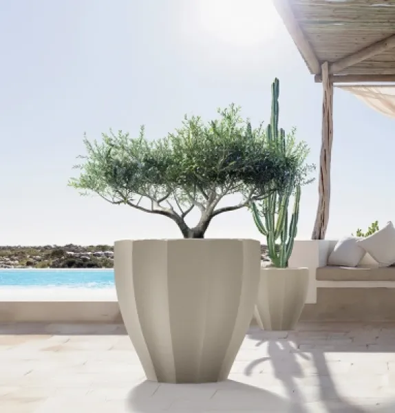 Rona to nowoczesna donica o nietypowym kształcie, zwężająca się ku dołowi i ozdobiona głębokimi, pionowymi żłobieniami. Dzięki szerokim krawędziom i masywnej sylwetce zyskuje wizualną stabilność, która doskonale wpisuje się w charakter przestrzeni zewnętrznych. Jej dopracowana forma i szlachetna faktura czynią ją idealnym wyborem do eleganckich aranżacji z roślinami.
