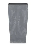 Donica kwadratowa Urbi Square o nowoczesnym, geometrycznym kształcie. Ciemnoszare matowe wykończenie imitujące beton ładnie podkreśla zieleń liści. Wysoka doniczka posiada wewnętrzny wkład o pojemności 14 litrów, który zapobiega przelaniu korzeni i zmniejsza ilość wykorzystywanego podłoża