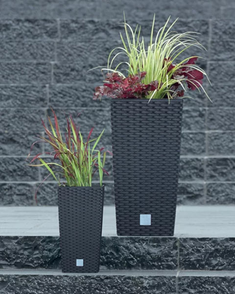 Donica ozdobna 49l z wkładem 21l Rato Square podkreśla piękno roślin w domu, w biurze lub na tarasie. Precyzyjnie wykonany wzór rattanowej plecionki w kolorze antracytowym pięknie kontrastuje z zielenią liści i kolorami kwiatów.