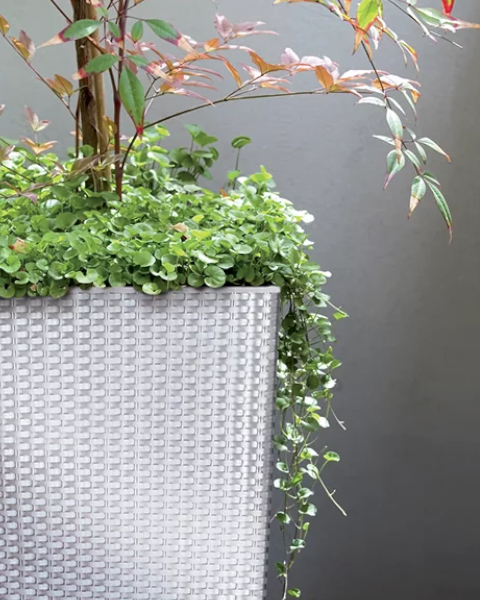 Donica ozdobna 49l z wkładem 21l Rato Square podkreśla piękno roślin w domu, w biurze lub na tarasie. Precyzyjnie wykonany wzór rattanowej plecionki w białym kolorze pięknie kontrastuje z zielenią liści i kolorami kwiatów.