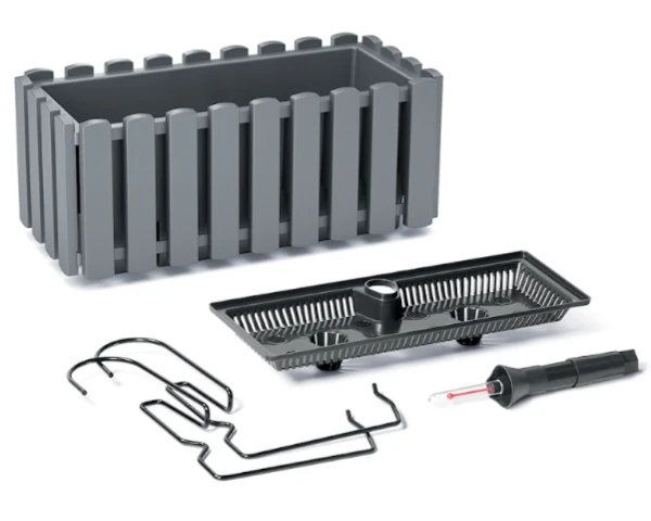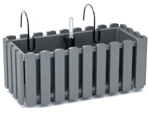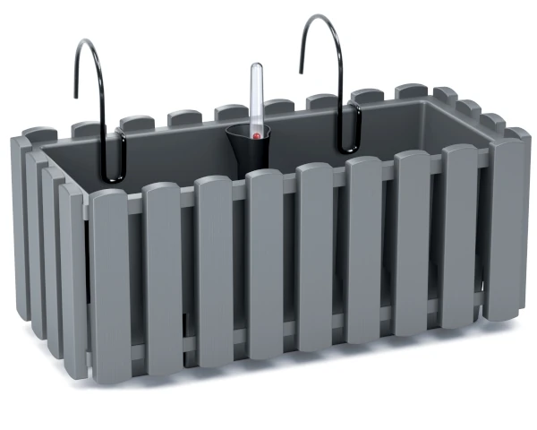 Doniczka na balustradę Fencycase z serii Boardee na pierwszy rzut oka wygląda jak skrzynka balkonowa z drewnianych listewek. Swoim kształtem i kolorystyką przypomina ręcznie wykonaną skrzynkę na kwiaty. Rustykalny charakter doniczki balkonowej wprowadza wyjątkową, ciepłą atmosferą. Antracytowy odcień pięknie podkreśla zieleń liści i kolory kwiatów. Podłużna skrzynka balkonowa ma prostokątny kształt i wiernie odzwierciedla wyroby z drewna. Dzięki temu nawiązuje do wiejskiego, spokojnego stylu. Jest to zestaw 3w1: do doniczki dołączone są metalowe haki do zawieszenia na balkonie, płocie lub ogrodzeniu. W komplecie znajduje się również system nawadniania dopasowany do skrzynki balkonowej, dzięki któremu nie trzeba martwić się o przelanie roślin. Dodatkowo, jeśli mieszkasz na piętrze w bloku woda nie kapie na dół z doniczki podczas podlewania i nie przeszkadza sąsiadom.