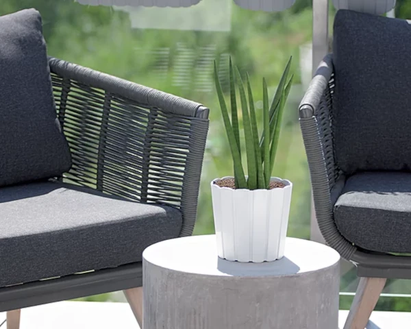 Doniczka okrągła w kolorze białym Boardee Basic bardzo ładnie pasuje na tarasie