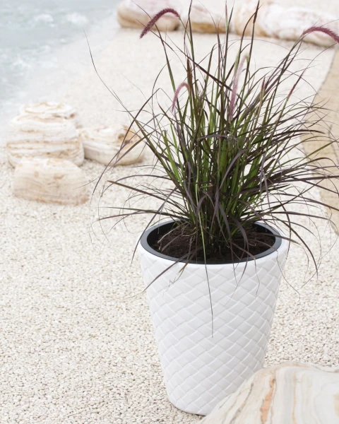 Donica okrągła o średnicy 30 cm sprzedawana w zestawie z wkładem o pojemności 8 litrów. Donica mrozoodporna może stać na zewnątrz przez cały rok.