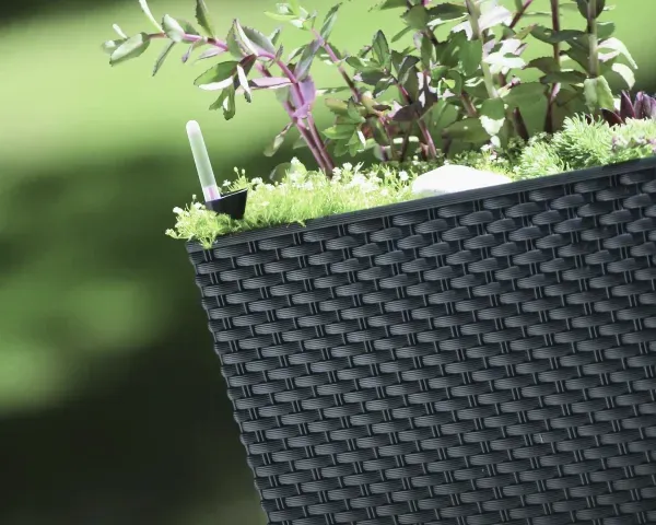 Donica samonawadniająca 51 cm Rato Case z tworzywa sztucznego imitującego rattanową plecionkę. Donica podłużna Rato posiada praktyczny system nawadniający, który pozwala kontrolować nawilżenie podłoża.