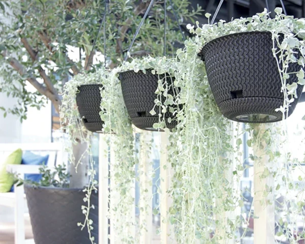 Porada od Stamats: Antracytowa Splofy Round o pojemności 4,8 litra to idealna "wisząca wyspa" dla roślin potrzebujących więcej miejsca na korzenie. Spróbuj posadzić w niej kompozycję z kontrastującą, jasnozieloną Tojeścią rozesłaną (Lysimachia) – efekt "wodospadu" liści na ciemnym tle będzie spektakularny.