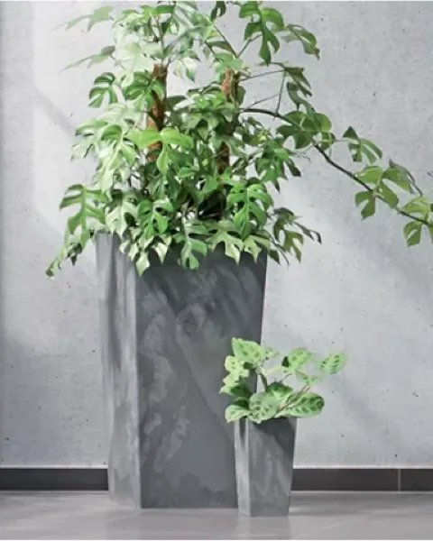 Donica kwadratowa Urbi Square o nowoczesnym, geometrycznym kształcie. Antracytowe matowe wykończenie imitujące beton ładnie podkreśla zieleń liści. Wysoka doniczka posiada wewnętrzny wkład o pojemności 5 litrów, który zapobiega przelaniu korzeni i zmniejsza ilość wykorzystywanego podłoża.
