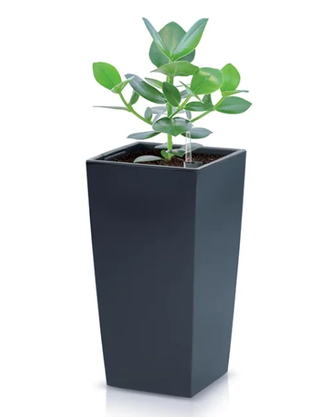 Donica kwadratowa Urbi Square o nowoczesnym, geometrycznym kształcie. Antracytowe matowe wykończenie ładnie podkreśla zieleń liści. Wysoka doniczka posiada wewnętrzny wkład o pojemności 5 litrów, który zapobiega przelaniu korzeni i zmniejsza ilość wykorzystywanego podłoża.