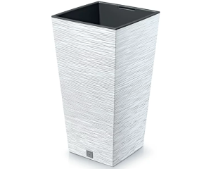 Doniczka wysoka z wkładem Furu jest wykonana z solidnego tworzywa sztucznego z prążkowaną fakturą. Donica wysoka posiada wewnętrzny wkład o pojemności 11 litrów, który zapobiega przelaniu korzeni i zmniejsza ilość wykorzystywanego podłoża. Doniczka kwadratowa w kolorze białym posiada na dnie praktyczny korek, który ułatwia odprowadzenie nadmiaru wody.