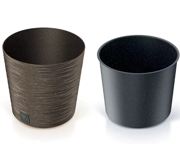 Doniczka dekoracyjna z wkładem w kolorze kawowym Furu Round Eco Wood podkreśla naturalne piękno roślin