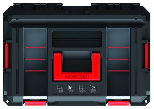 - Skrzynia posiada w środku wyjmowane przegrody i dwa nosidła ułatwiające organizację przestrzeni dla narzędzi ręcznych