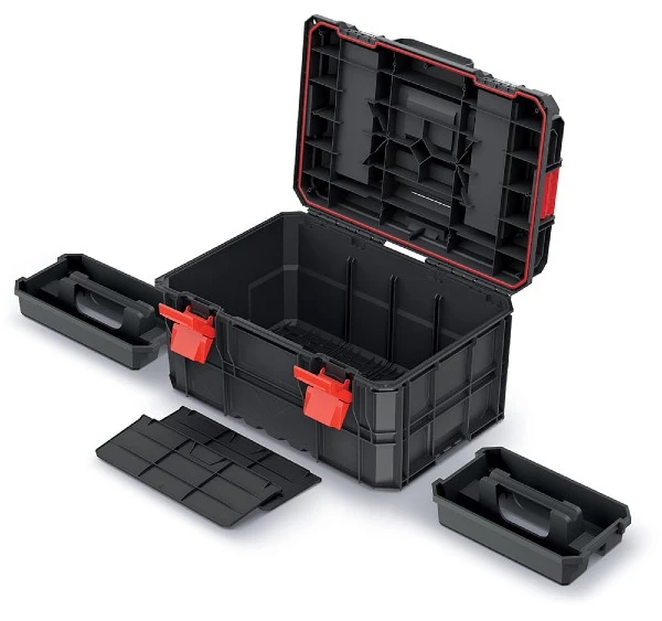 Duża skrzynia na narzędzia dedykowana przede wszystkim profesjonalistom pracującym na co dzień w ciężkich warunkach. Pyłoszczelne i odporne na działania wody pojemniki warsztatowe służące do przechowania i transportowania ciężkich narzędzi.